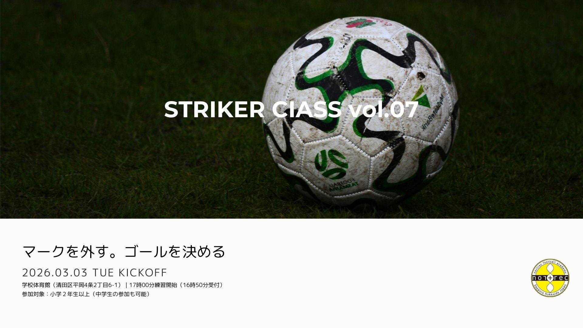 notrec football academyでは、スクール会員・非会員に関係なく、どなたでもご利用可能な単発型のレッスン“ストライカークラス”を2026年3月3日(火)に開催しています。